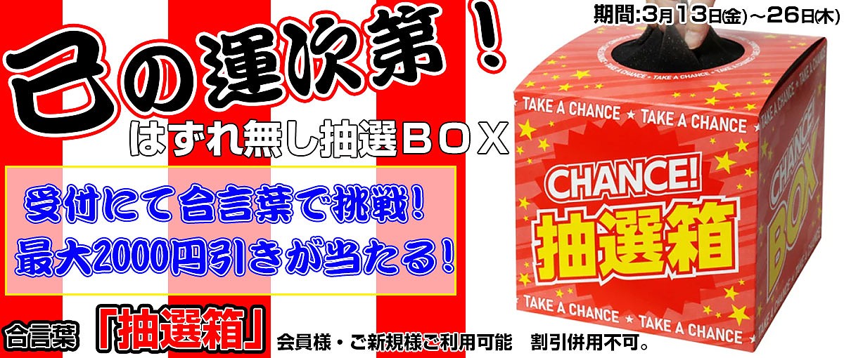 受付にて合言葉「抽選箱」、もしくは画面提示してください。 受付にて外れ無しの抽選BOXで番号を選んでください! 最大その場で2000円OFF致します!